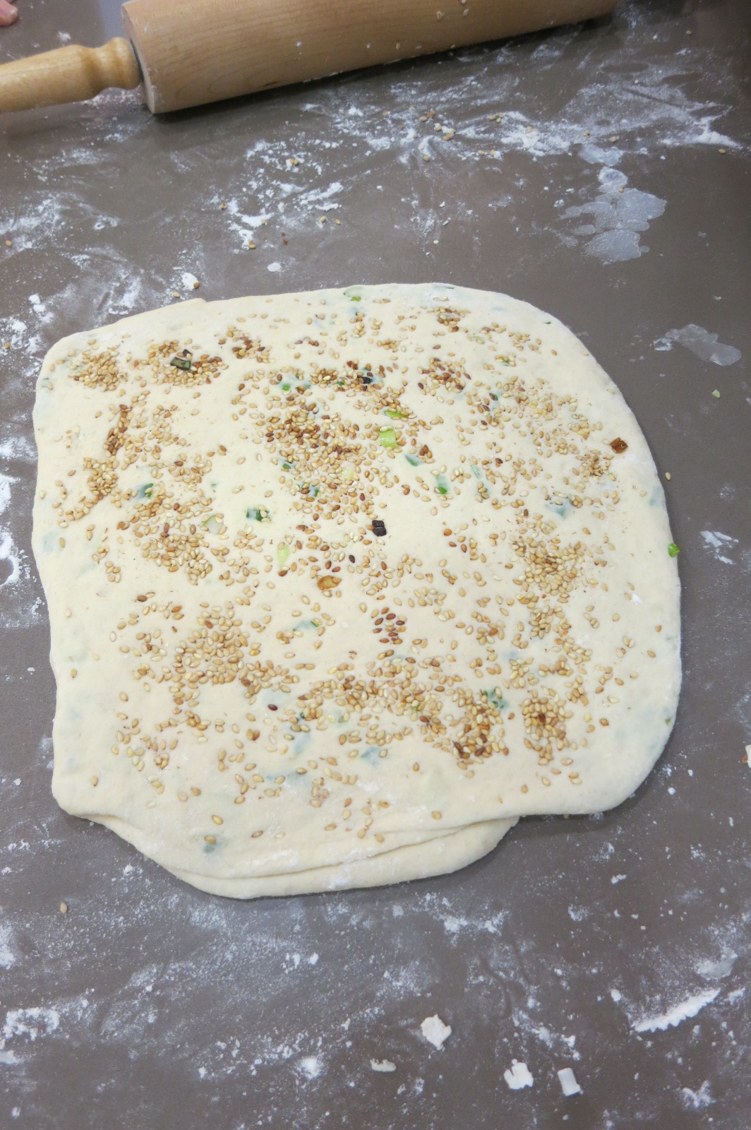 11. Sprinkle sesame seeds onto dough. Roll out more so sesame seeds stick on the dough. Finished dough should be approximately 1/2 inch thick.