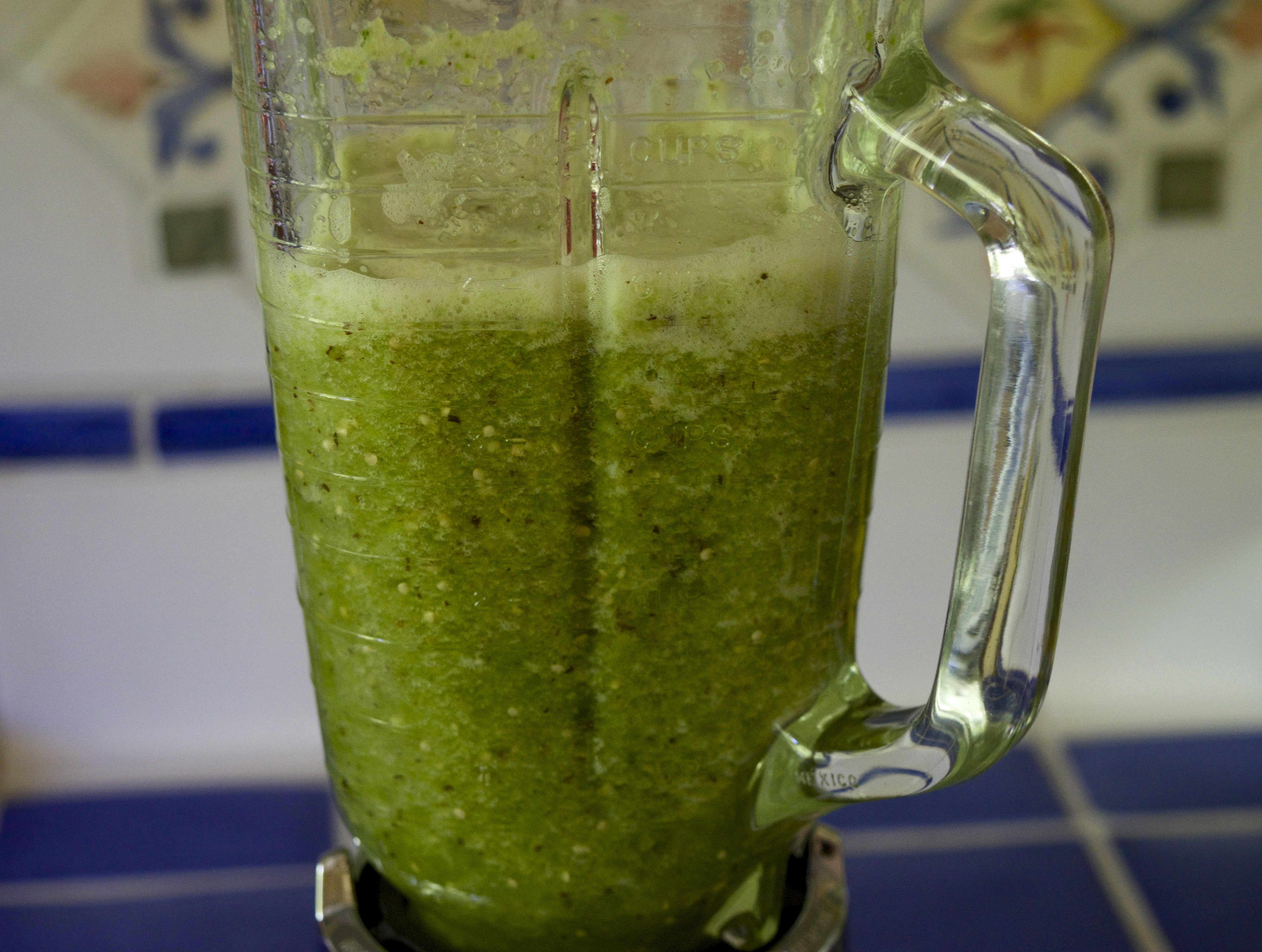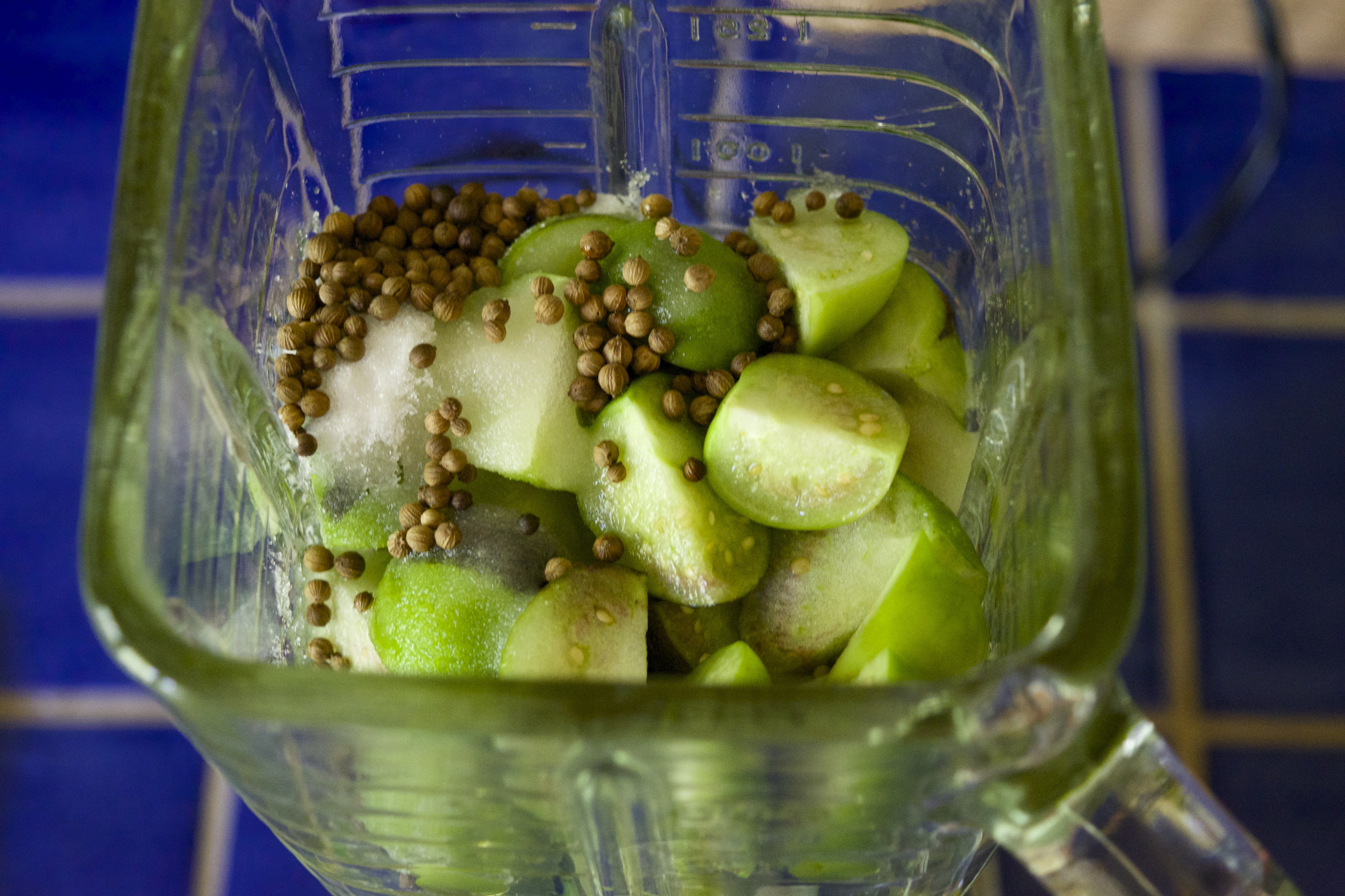3. In a blender, combine the tomatillos, green peppers, jalapeño, cider vinegar, coriander and the remaining ½ cup of sugar.