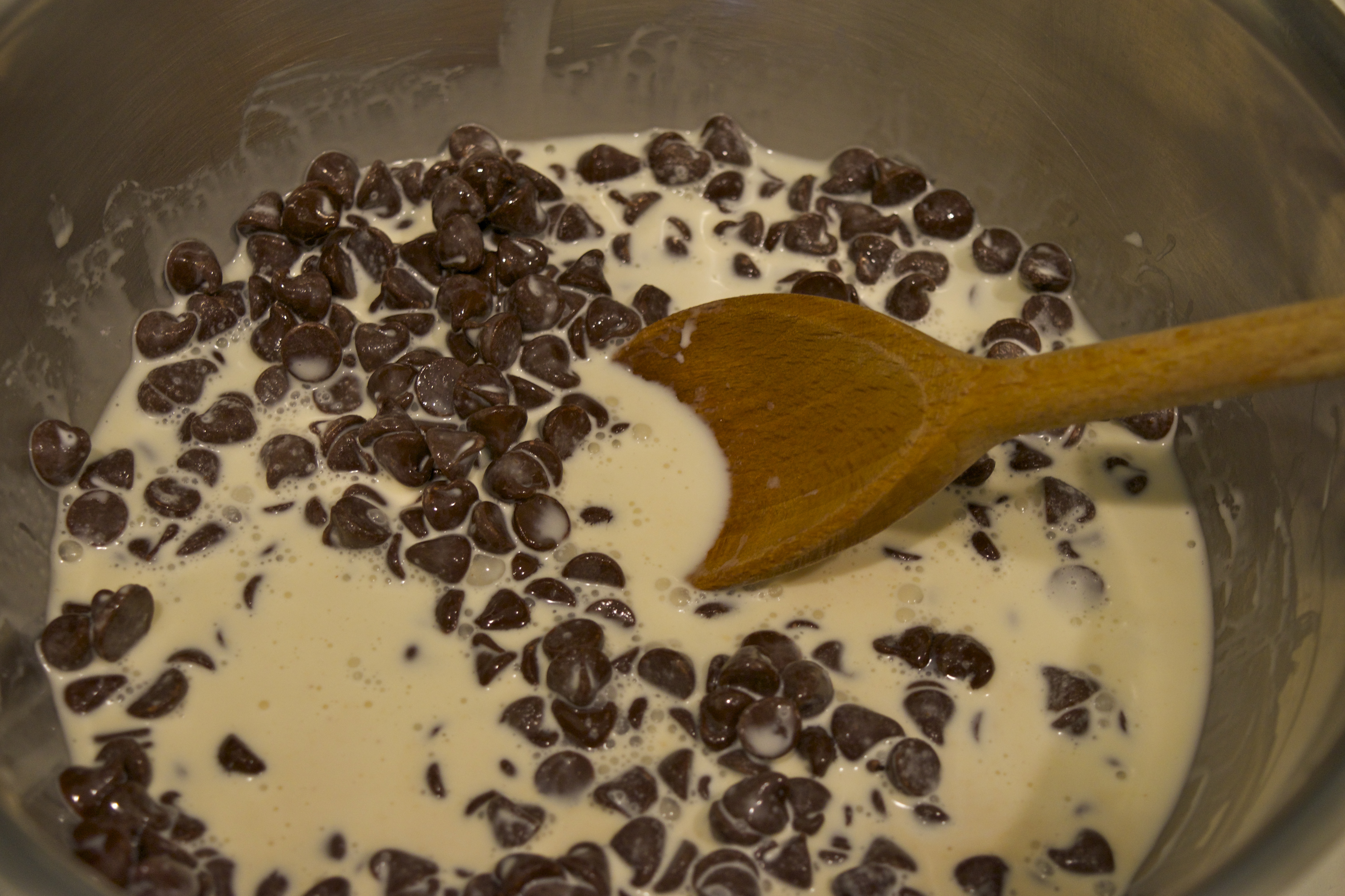 8. Place the chocolate chips, corn syrup, vanilla, and cream into a large saucepan.