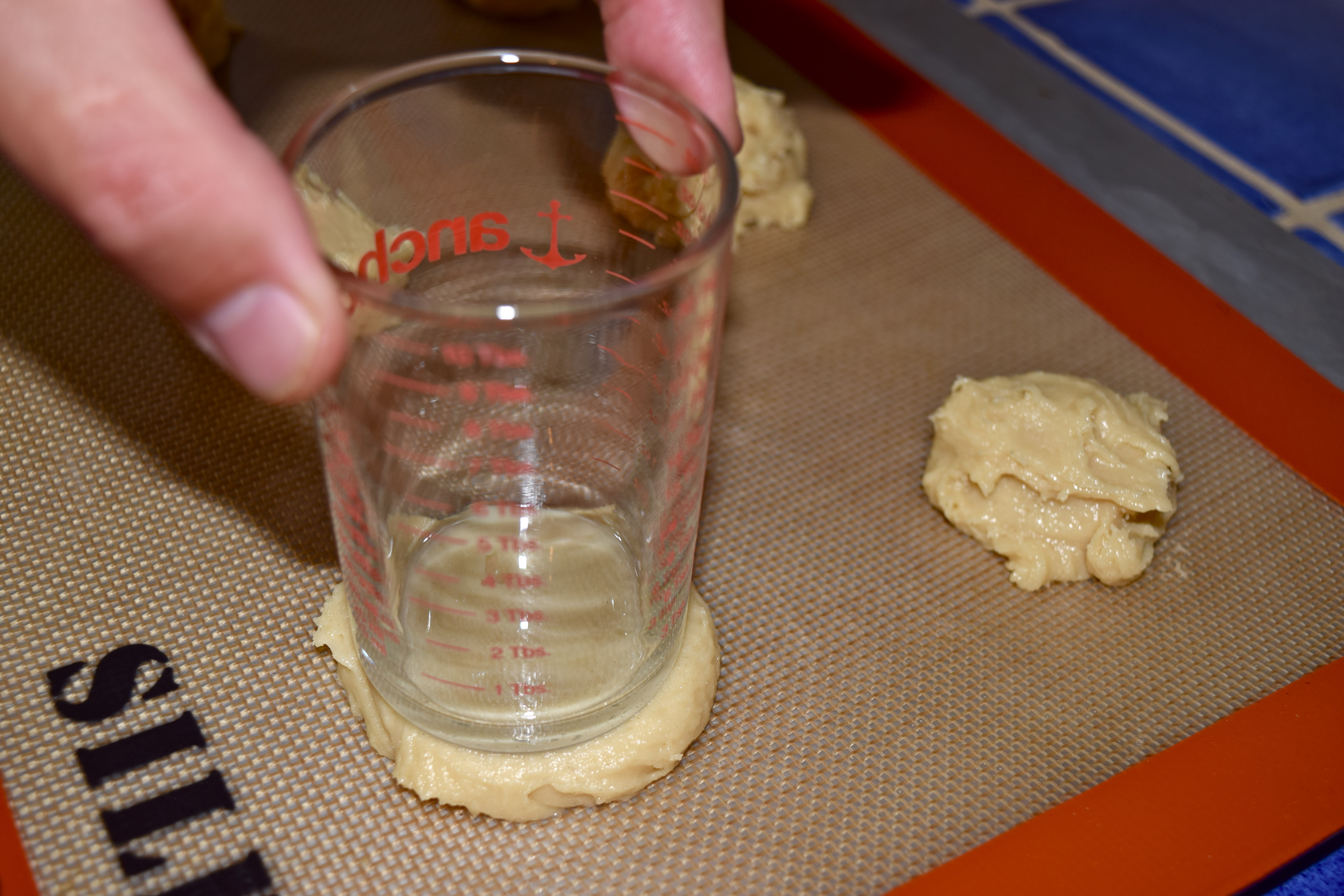 6. Flatten each mound of dough to a circle about 1 ½” across; wet your fingers or a knife, or grease the bottom of a drinking glass or measuring cup to do this. Leave 2″; to 2 1/2″ between each cookie, for expansion.