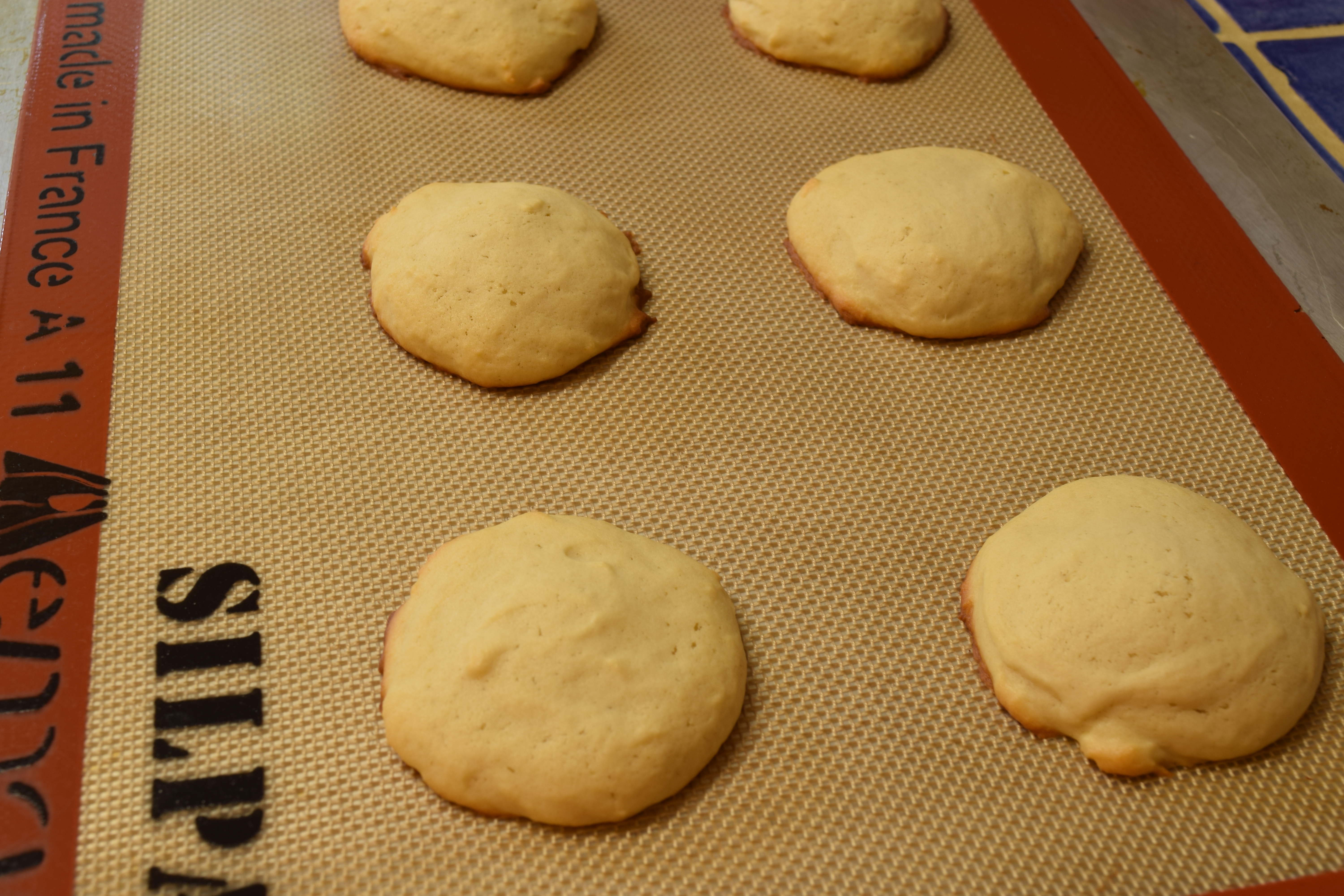 7. Bake the cookies for about 10 to 11 minutes, or until they’re slightly brown on the bottom, but not colored on top. You may see the barest hint of browning around the edges, but these cookies are supposed to be soft and cake-like, so don’t over bake them. Remove the cookies from the oven, and let them cool right on the pan as you make the frosting.