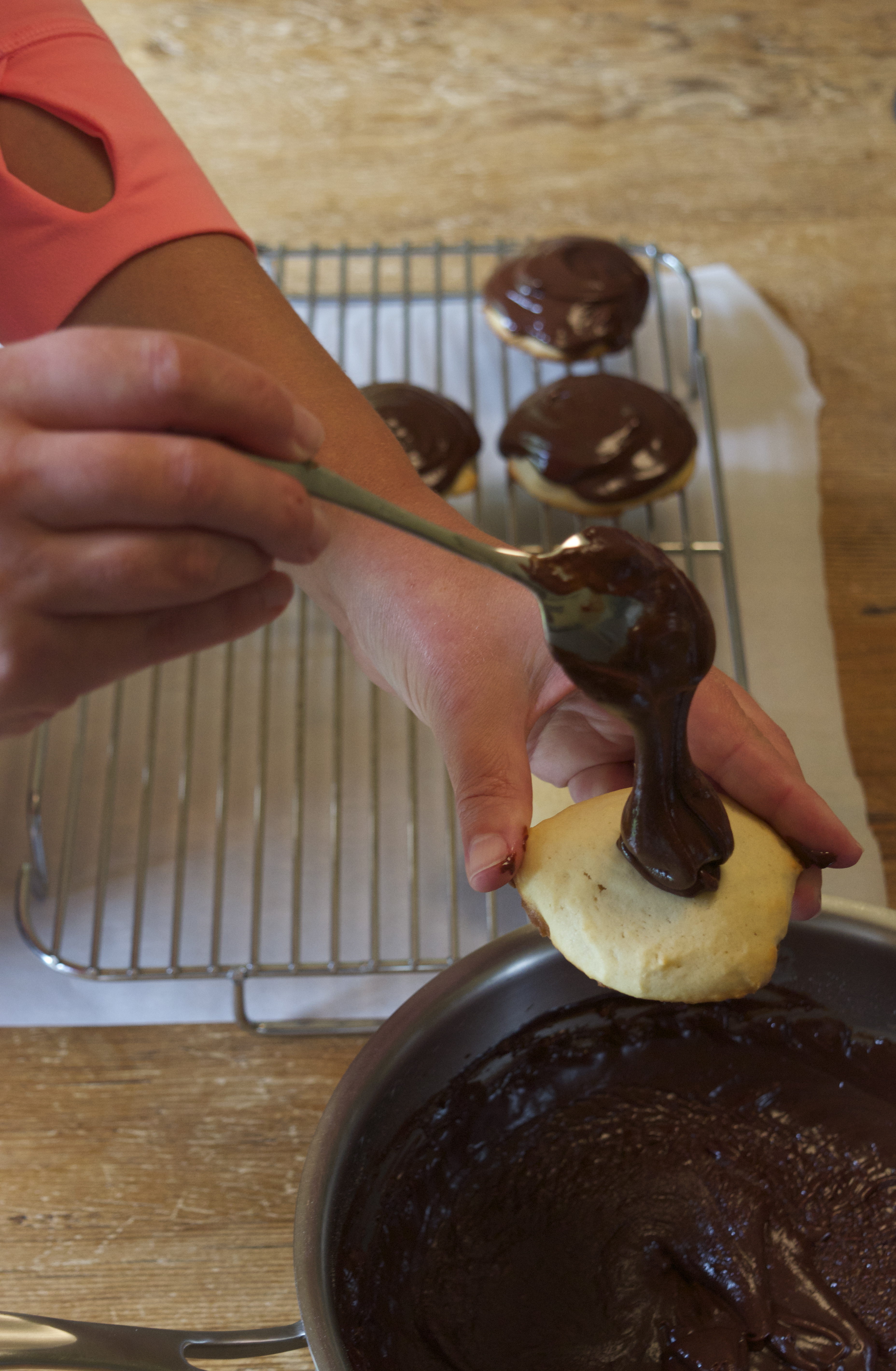 11. With a large spoon, take a large dollop of cooled icing and swirl around to really give it a good coating. Set the cookies back on the baking sheet.