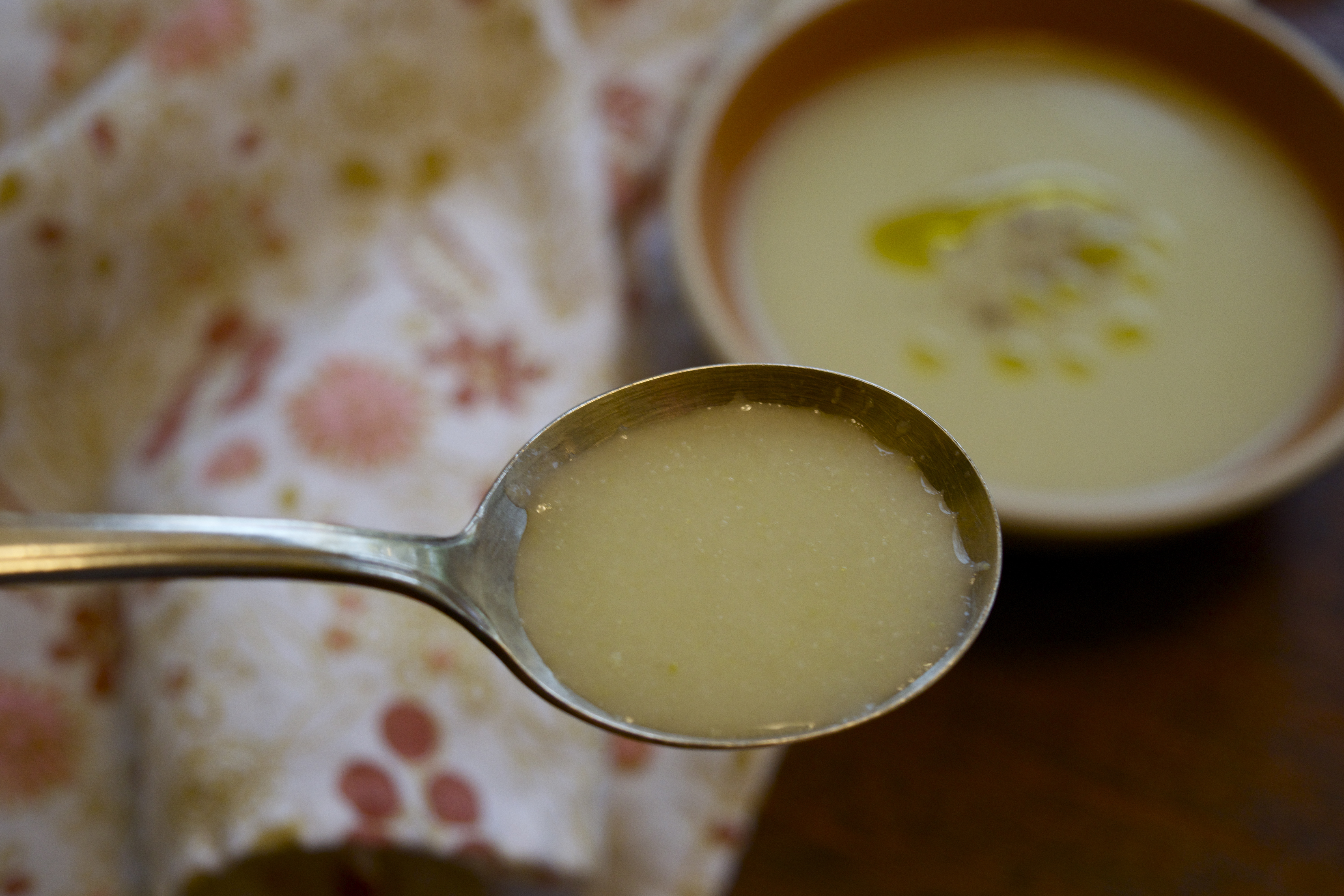 I recently discovered a soup that fits my post-Thanksgiving simple meal plan. This cauliflower soup is from Paul Bertolli, who worked in the kitchens of Chez Panisse and Oliveto in the Bay Area. The soup is deceptively elegant and hearty, despite its minuscule ingredient list. How can a soup with cauliflower, water and onion impart such a decadent flavor?