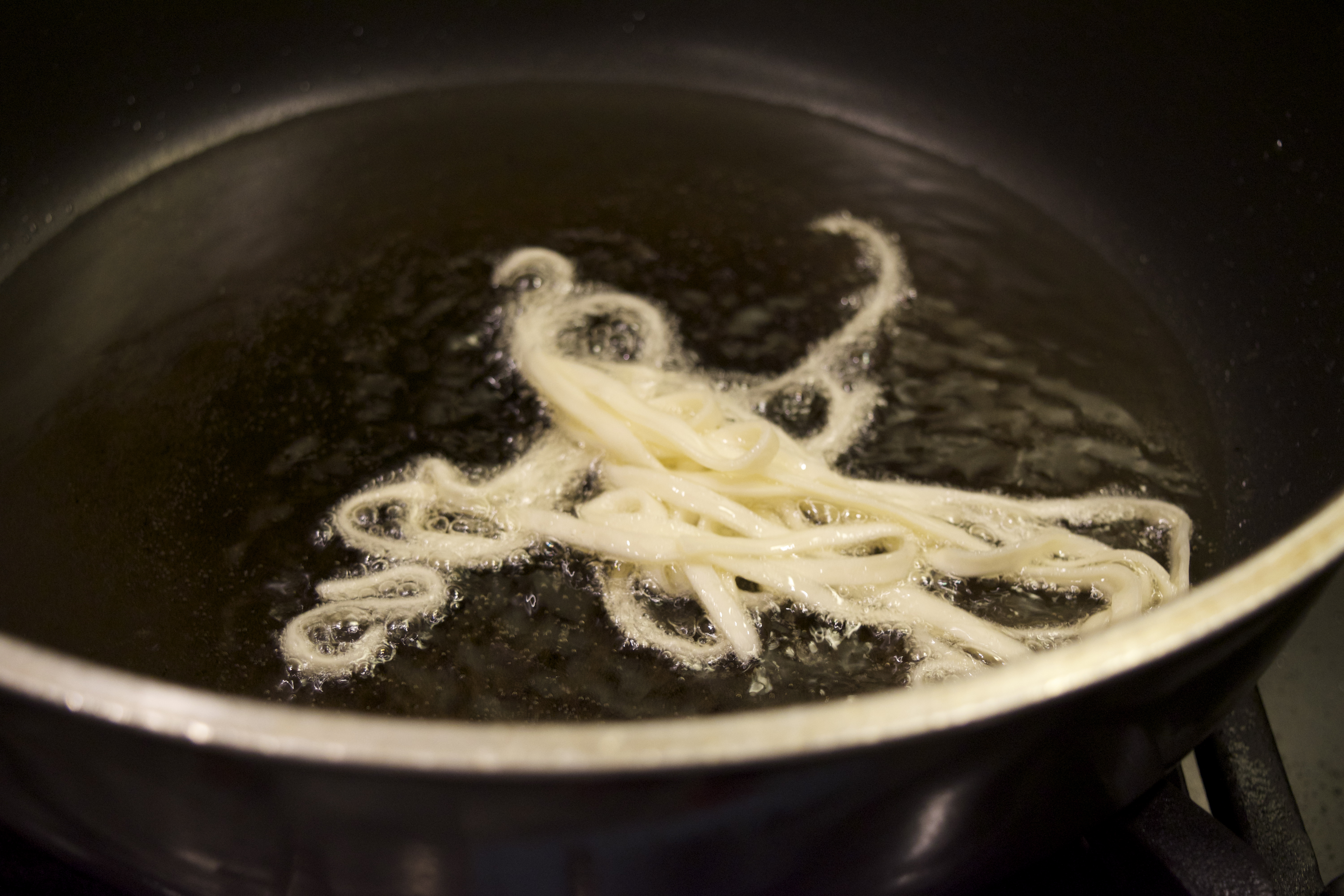 4. Separate out about a quarter of the pound of noodles (enough noodles to make a crispy fried-noodle topping for four bowls) and set the remaining noodles aside. Heat 1 cup of vegetable or canola oil in a large wok over high heat until shimmering. Working in batches, add noodles to oil and fry, stirring and flipping until golden brown and crisp. Transfer to a paper towel-lined plate. Season with salt and set aside.