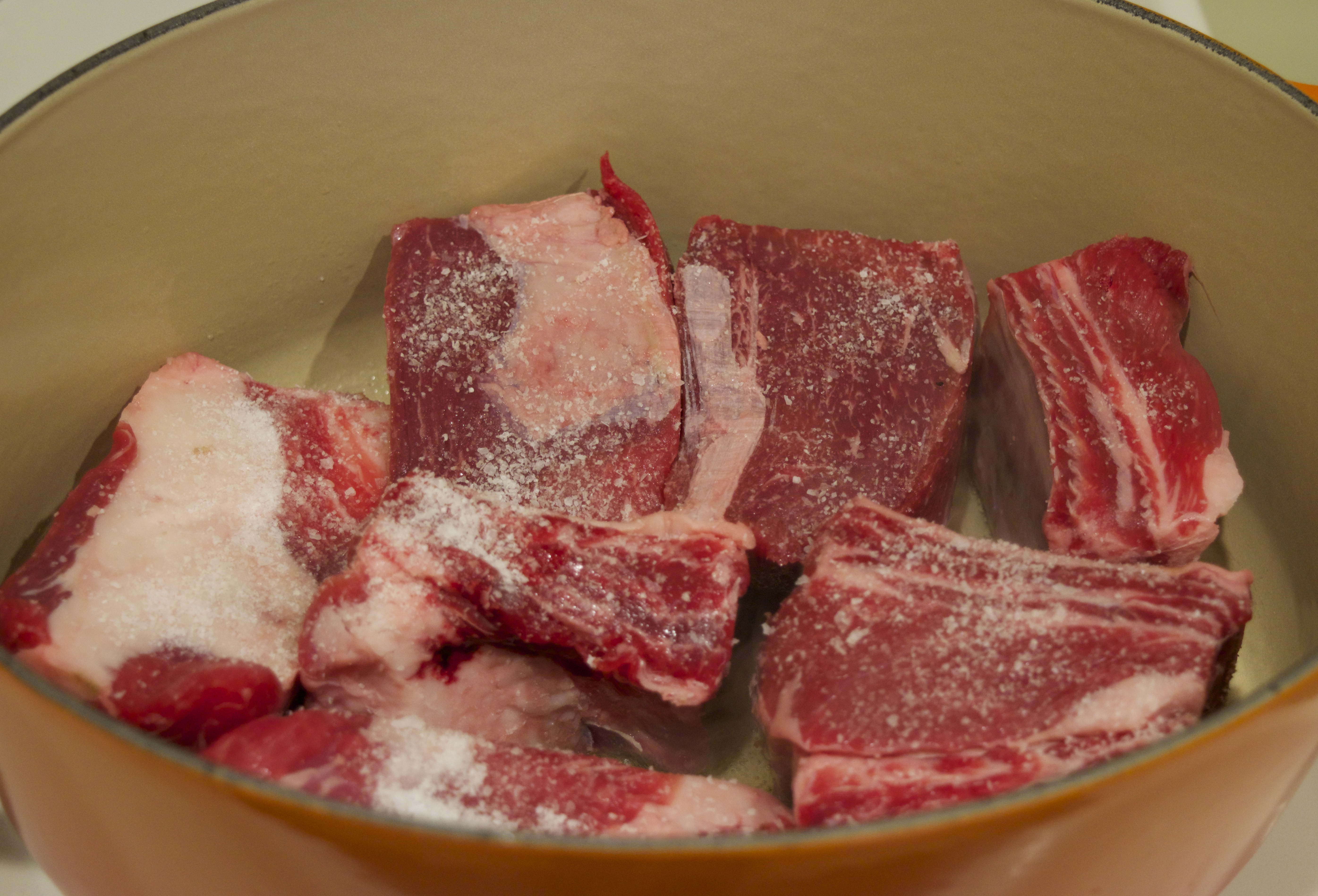 1. In a large heavy-bottomed pot or Dutch oven, heat the canola oil over medium-high heat. Season the short ribs with salt and add to the oil, cooking until browned on all sides, 12 to 14 minutes.