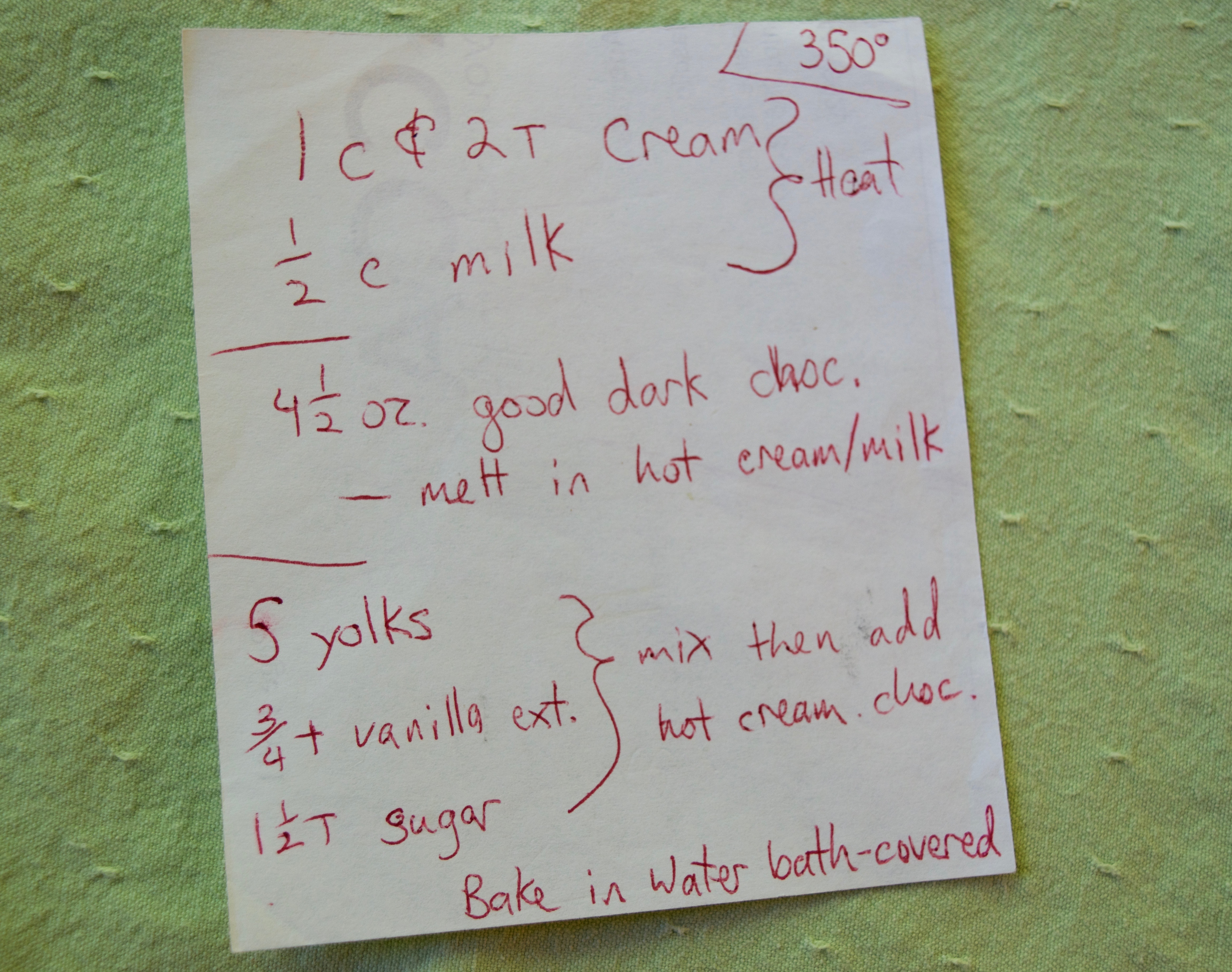 As we were paying our bill, a man came up to our table and introduced himself as Robert Masullo, the owner of Masullo Pizza. I gushed about how much I loved his chocolate pots de crème. He said he would be happy to provide me with the recipe, but he would need to adjust it down to home kitchen proportions. He returned to the kitchen and a few minutes later reappeared with a scrap of paper with his chocolate pots de crème recipe on it. I’ve been making Robert Masullo’s chocolate pots de crème ever since.