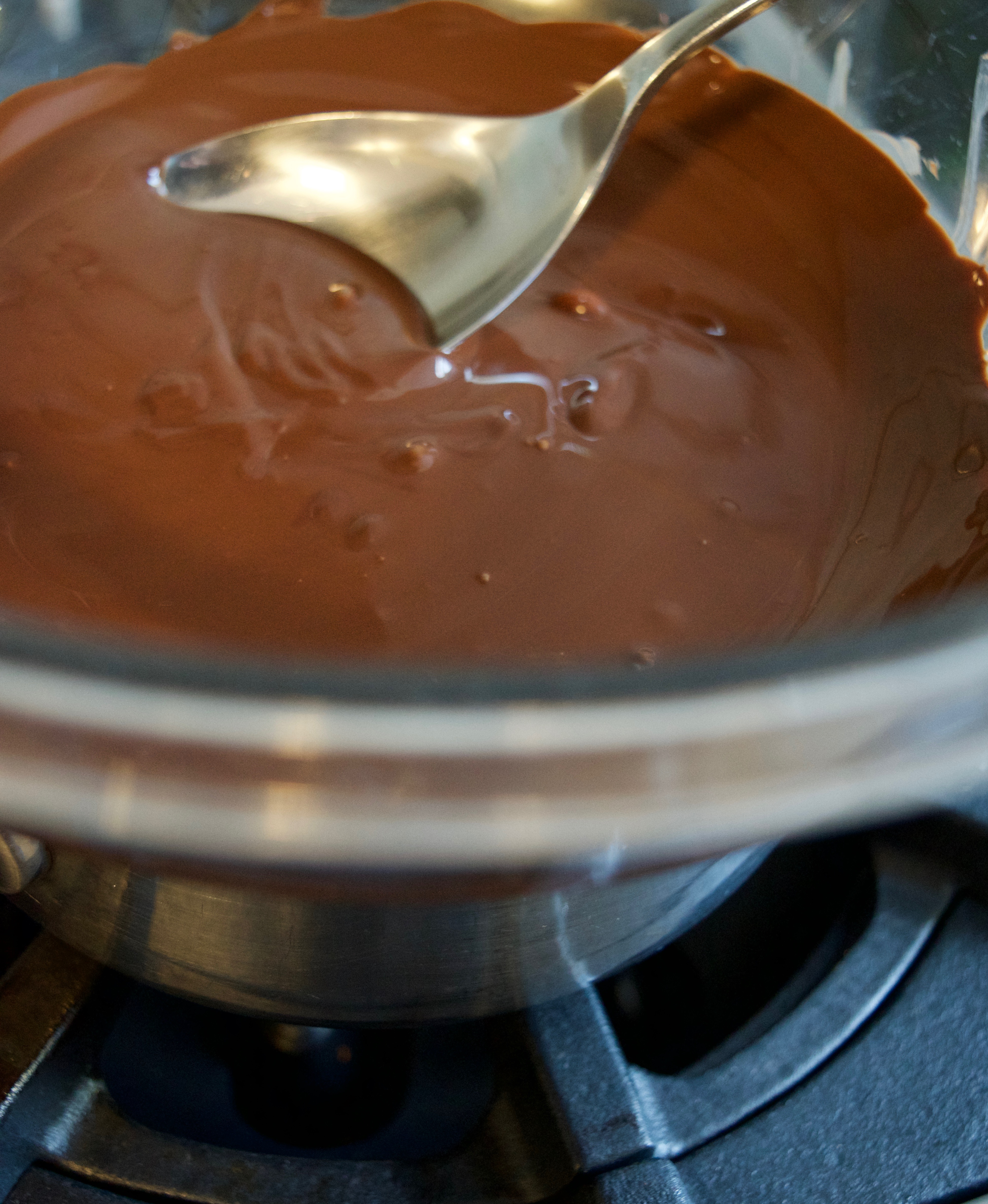 2. Add 7 ounces of bittersweet chocolate to a metal or glass bowl. Set over saucepan of simmer water. Stir until chocolate is melted and smooth. Remove bowl from over water.