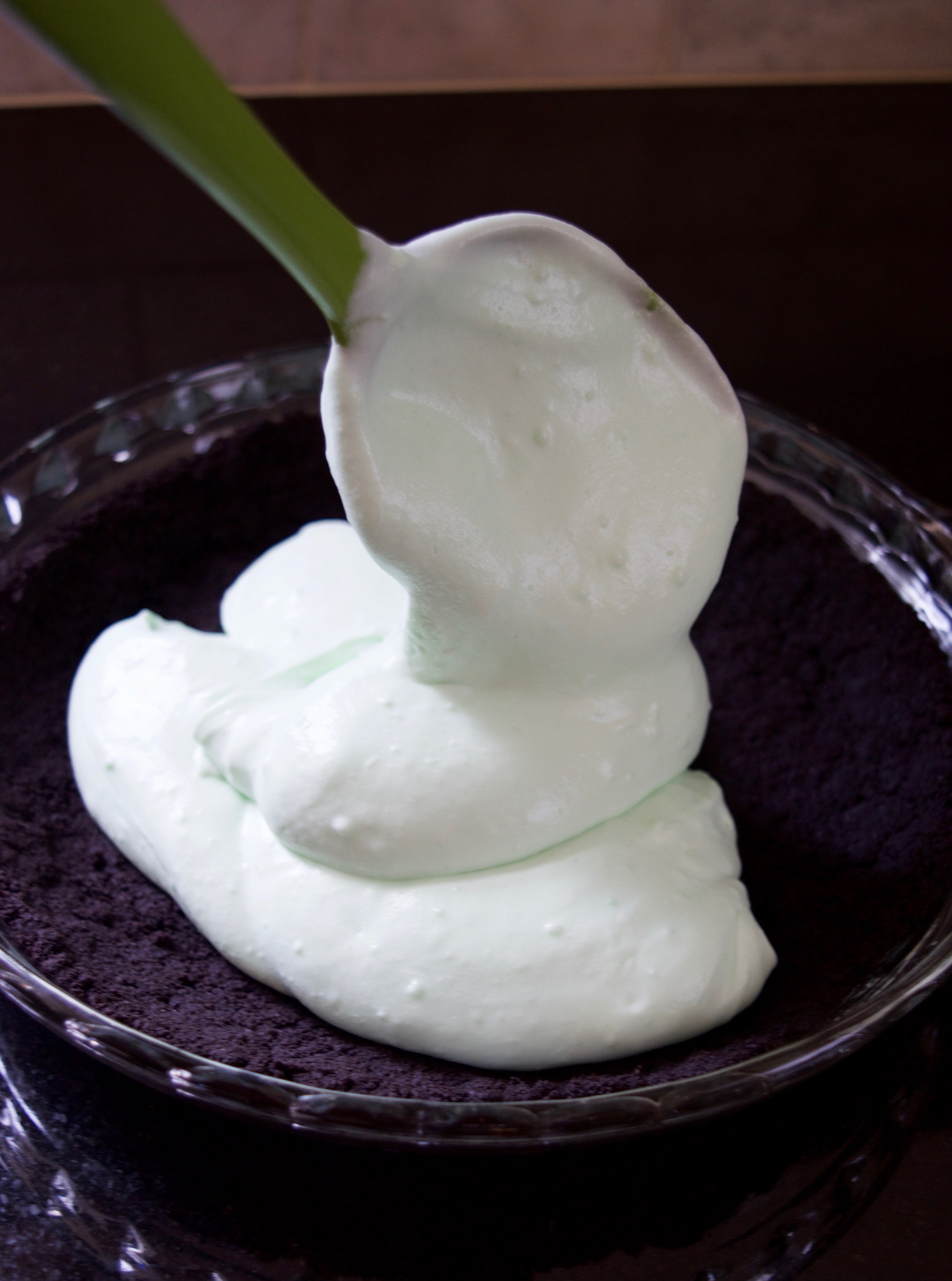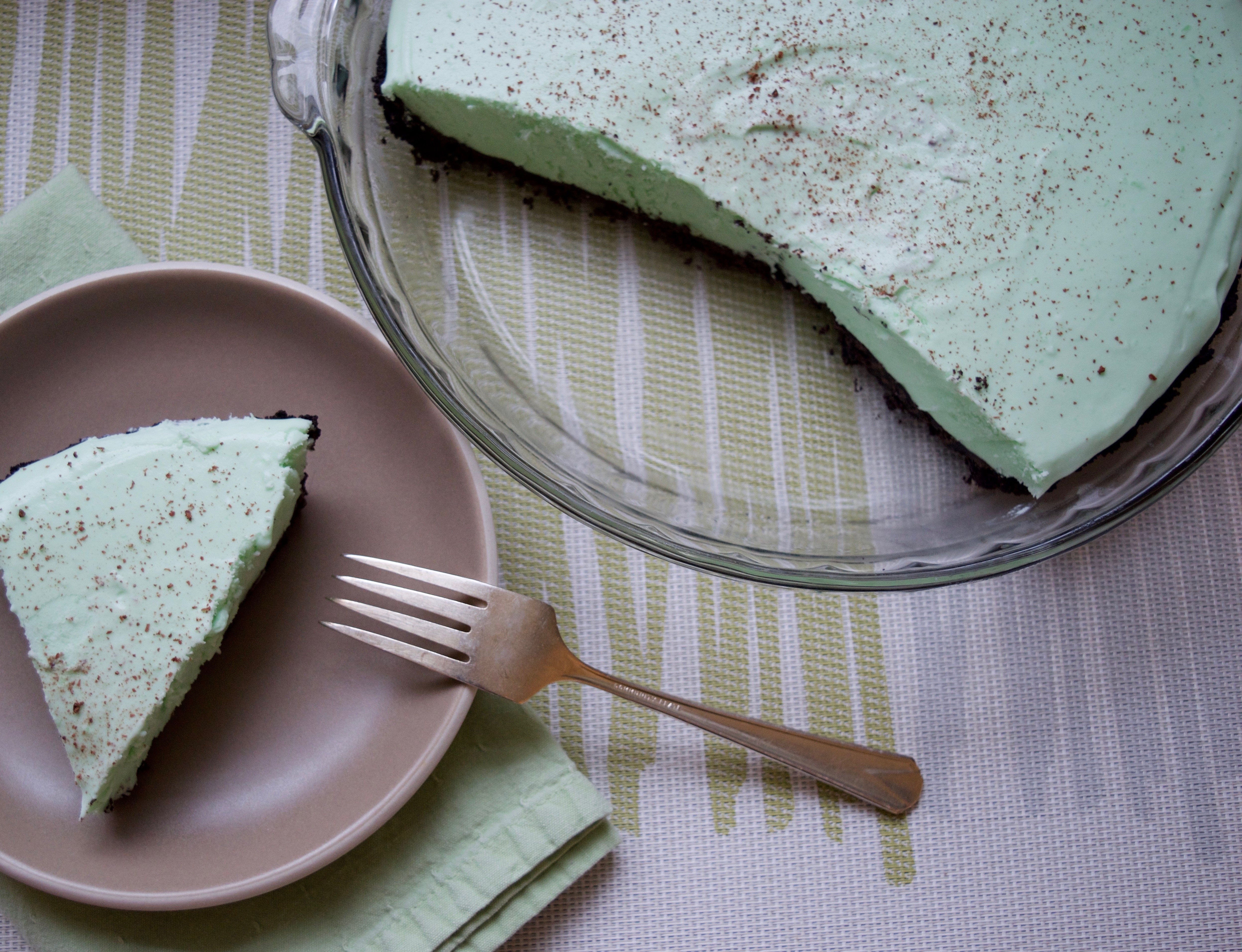 This year’s pie is a classic. Grasshopper pie plays into my love of the combination of mint and chocolate. I can’t remember where I acquired my recipe for grasshopper pie, but I do know I’ve been making it for a long time, as evidenced by the ‘In chocolate I trust’ notepad the recipe is scribbled on. It’s definitely one of those recipes that was most likely popular in the ’60s when the grasshopper cocktail was at its height in popularity.