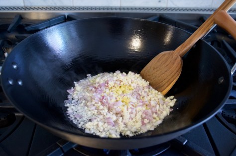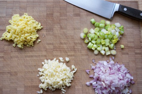 4. Add ginger, garlic and shallot to pan. Let cook for 2 minutes. Lower heat and add sliced green onions.