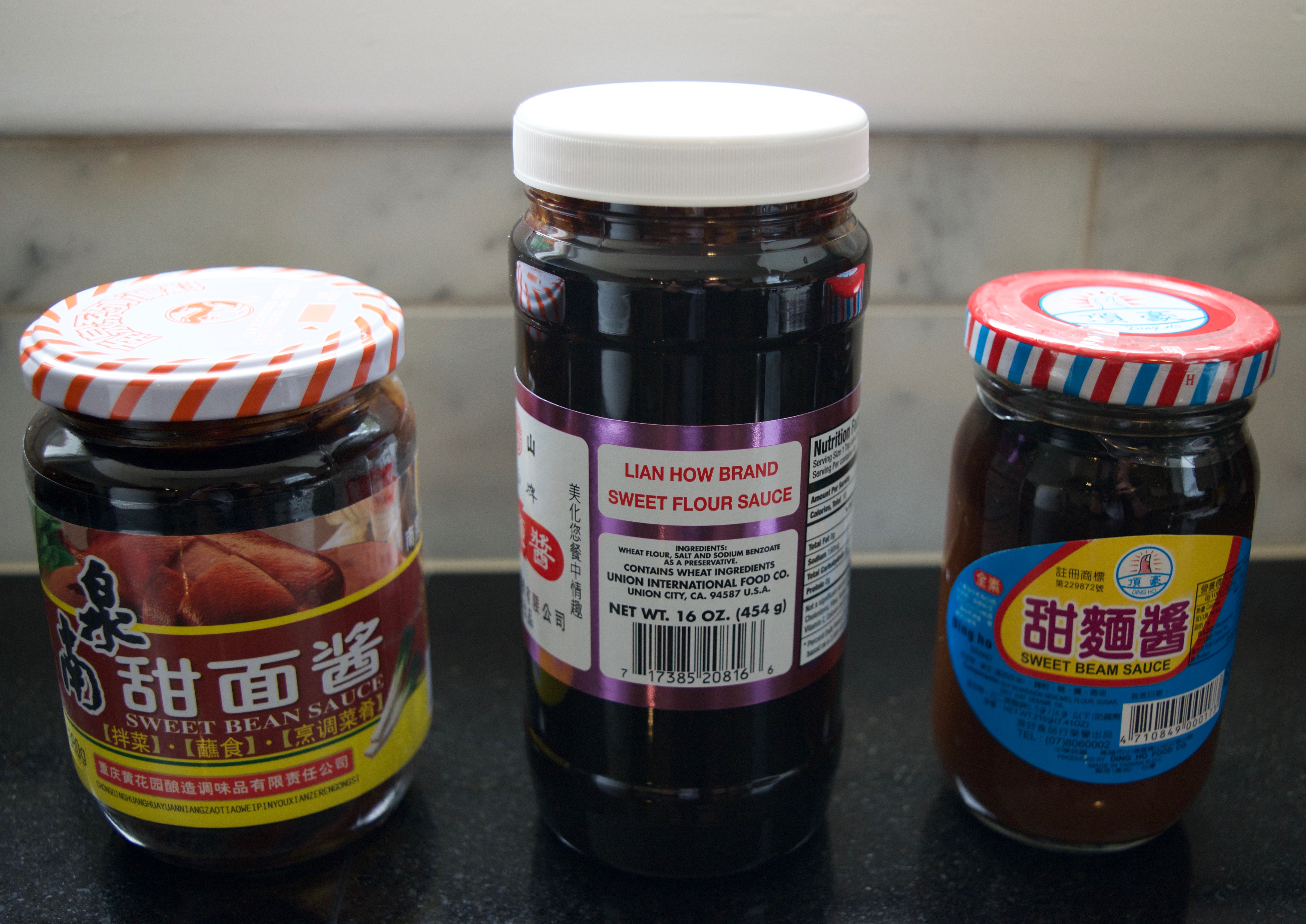 Tian mian jiang (sweet bean sauce or sweet flour sauce) can be found in Asian markets. It’s not hoisin sauce, nor is it black been sauce. These three brands pictured below are the most common I’ve found in stores. Tian mian jiang can also can be ordered online.