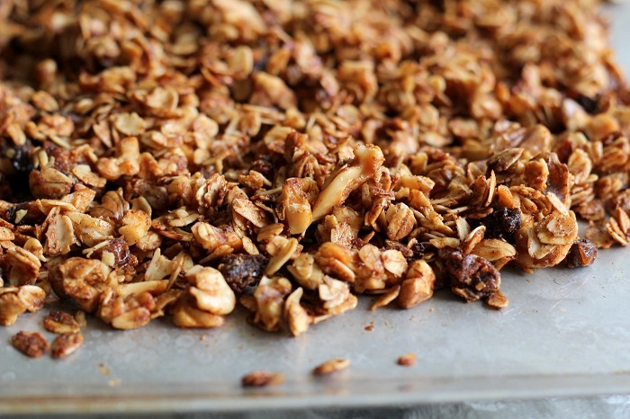 - Stir in raisins, then spread granola evenly in pan; set on a wire rack and cool to room temperature. Loosen dried granola with a spatula; store in airtight container.