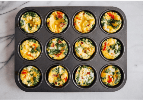 - Evenly distribute the cooked vegetables into the 12 muffin tins. Pour the egg mixture on top to fill up each cup.