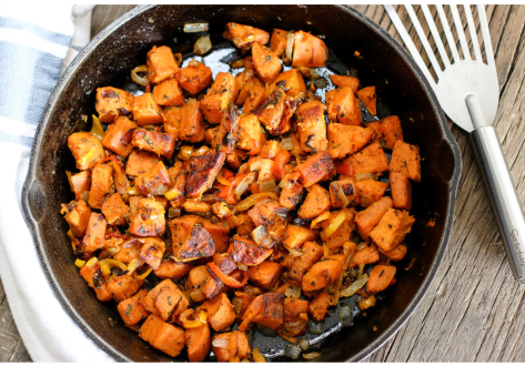 - Add the onions and sausage to the sweet potatoes and stir to combine. Line a large baking sheet with foil or parchment paper, transfer the sweet potato mixture onto it, and spread it out evenly. Roast until the sweet potatoes are soft and browned, 30 to 45 minutes (roasting time depends on the size and uniformity of the sweet potato chunks, as well as the variety of sweet potato you buy).